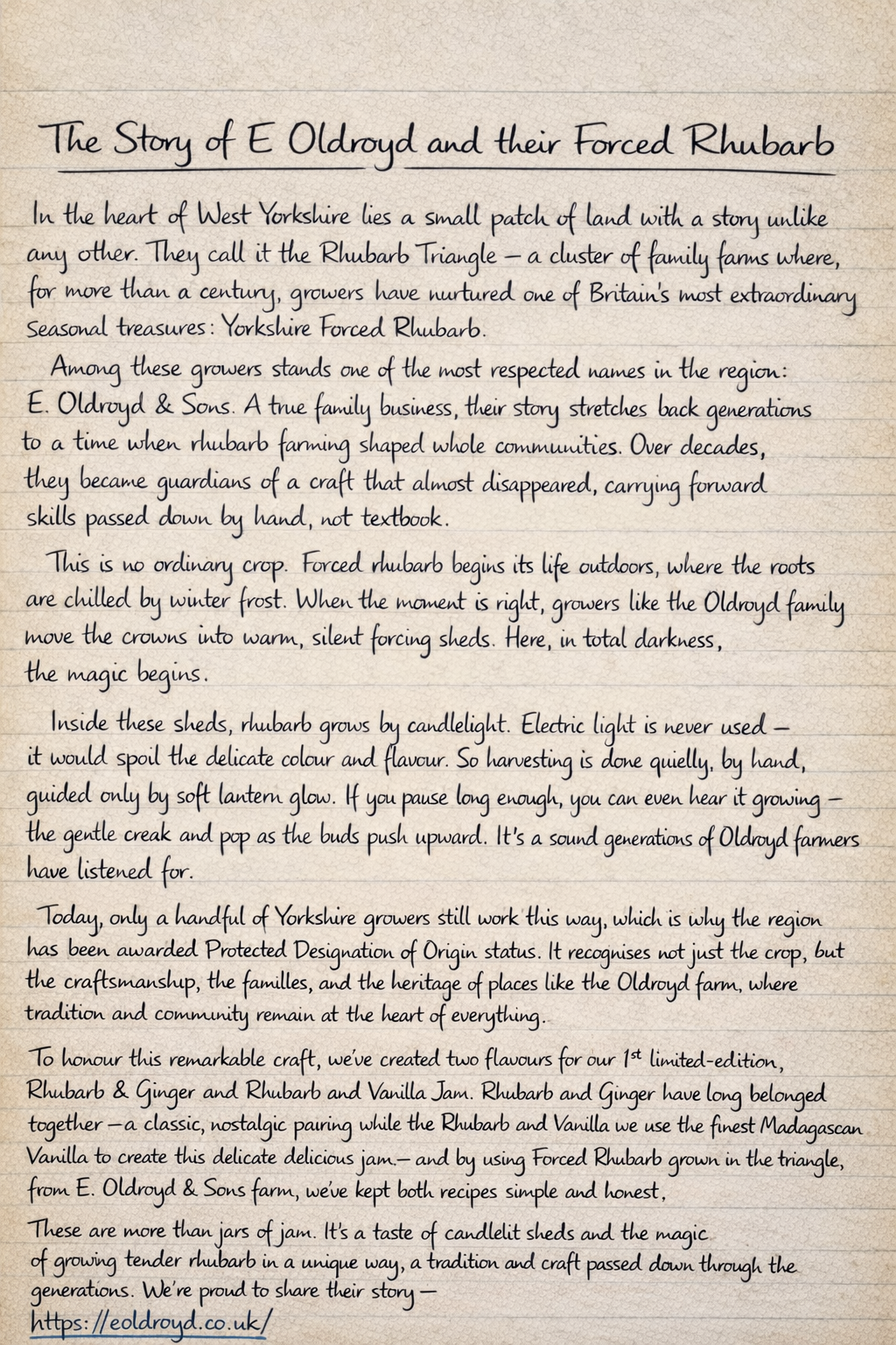 In honour of this very special ingredient our first limited edition products are the Forced Rhubarb jams. The rhubarb is grown slowly in the cold, dark winter by candlelight and our rhubarb jams are only available to purchase at the end of February/March while stocks last. The rhubarb is sweet and tender and a beautiful pink colour.